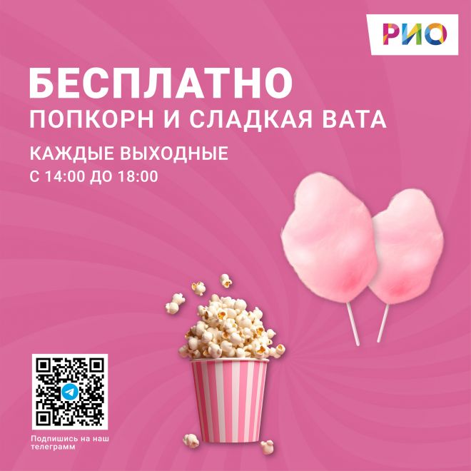 Каждые выходные будем БЕСПЛАТНО угощать юных посетителей воздушной сахарной ватой и хрустящим попкорном!