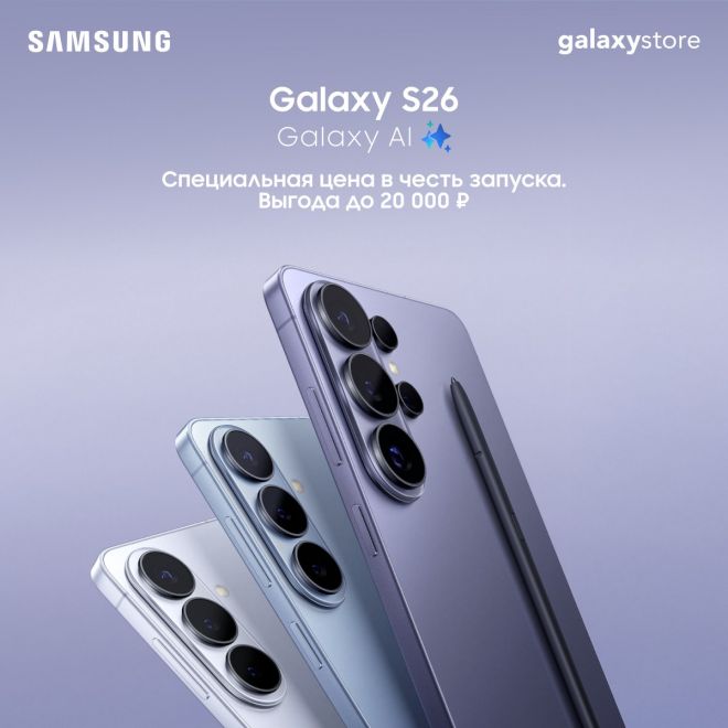 До 26 марта 2026 года оформите предзаказ и получите выгоду до 20 000 рублей на смартфон Galaxy S26 Ultra и выгоду 5 000 рублей на Galaxy S26 и S26+, а также 5% кешбэк бонусами на карту лояльности за любой предзаказ.