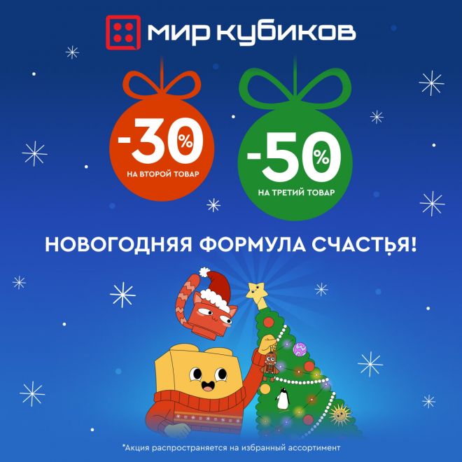 До 24 декабря 2025 года в магазине «Мир Кубиков» добавьте к выбранному набору еще один, и он будет стоить на 30% дешевле. А если возьмете третий, то его цена упадет вдвое!